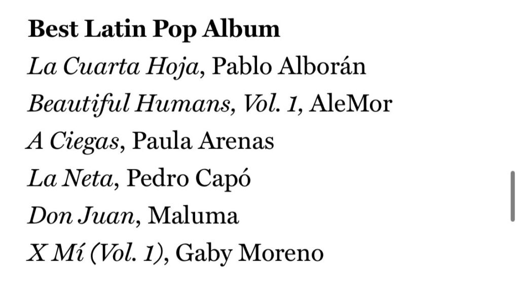 Congratulations 66th #GRAMMYs Best Latin Pop Album nominees: @pabloalboran; AleMor; @paulaarenas__; @pedrocapo; @maluma; and Gaby Moreno. Watch live: https://t.co/zovEzgeZPG pic.twitter.com/cFkVxaBDz0