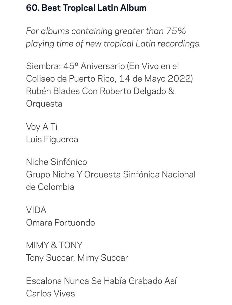 Congrats 66th #GRAMMYs Best Tropical Latin Album nominees: @rubenblades Con Roberto Delgado & Orquesta; @iamluisfigueroa; @gruponiche Y Orquesta Sinfónica Nacional de Colombia; @omaraportuondo; @tonysuccar, @mimysuccarmusic; @carlosvives. Watch live: https://t.co/zovEzgeZPG pic.twitter.com/JkMHNWYUW9